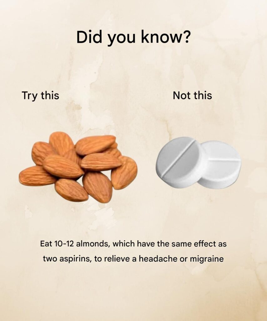 Eating 10–12 almonds can have an effect similar to two aspirins thanks to their natural salicin content, a compound with analgesic and anti-inflammatory properties.